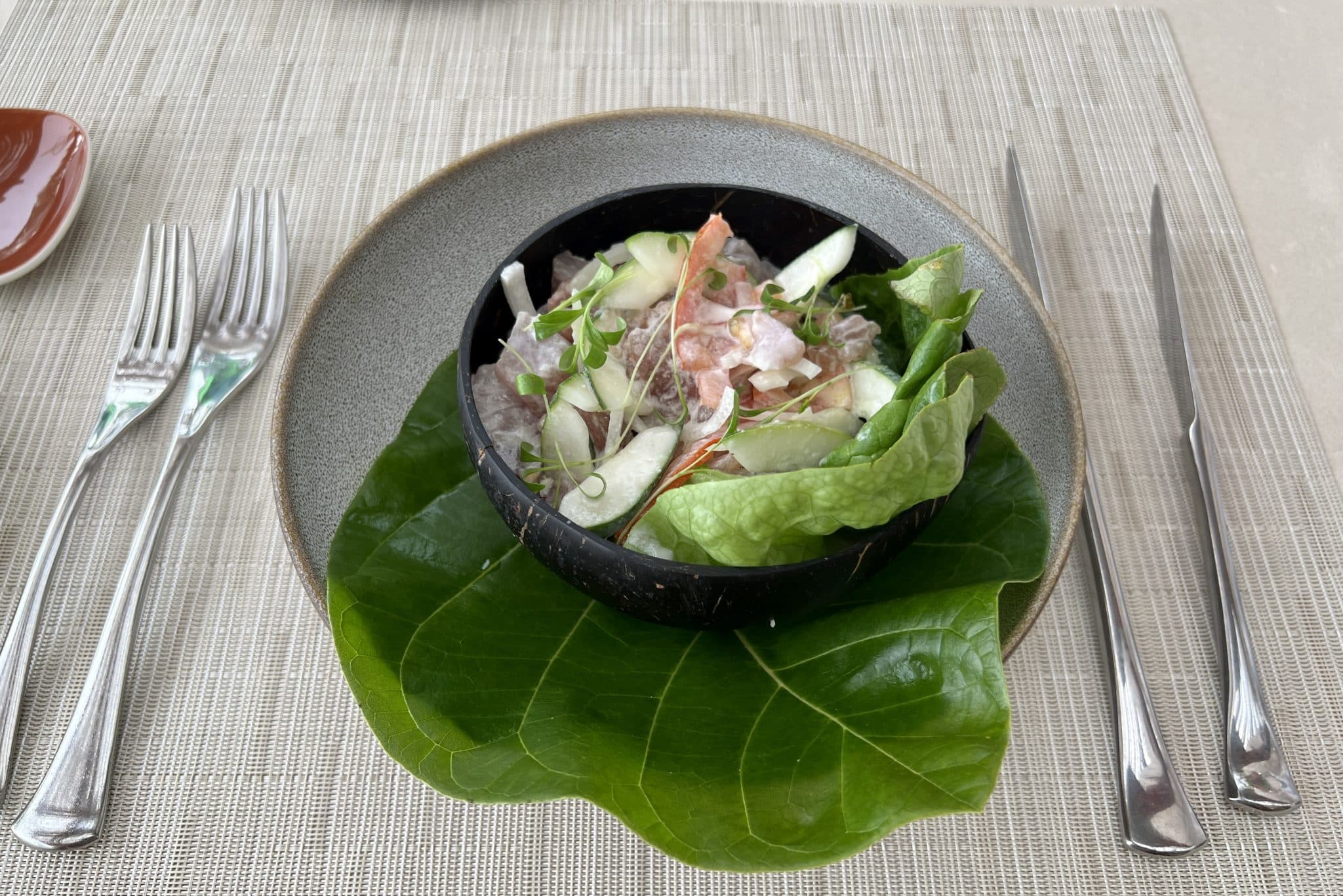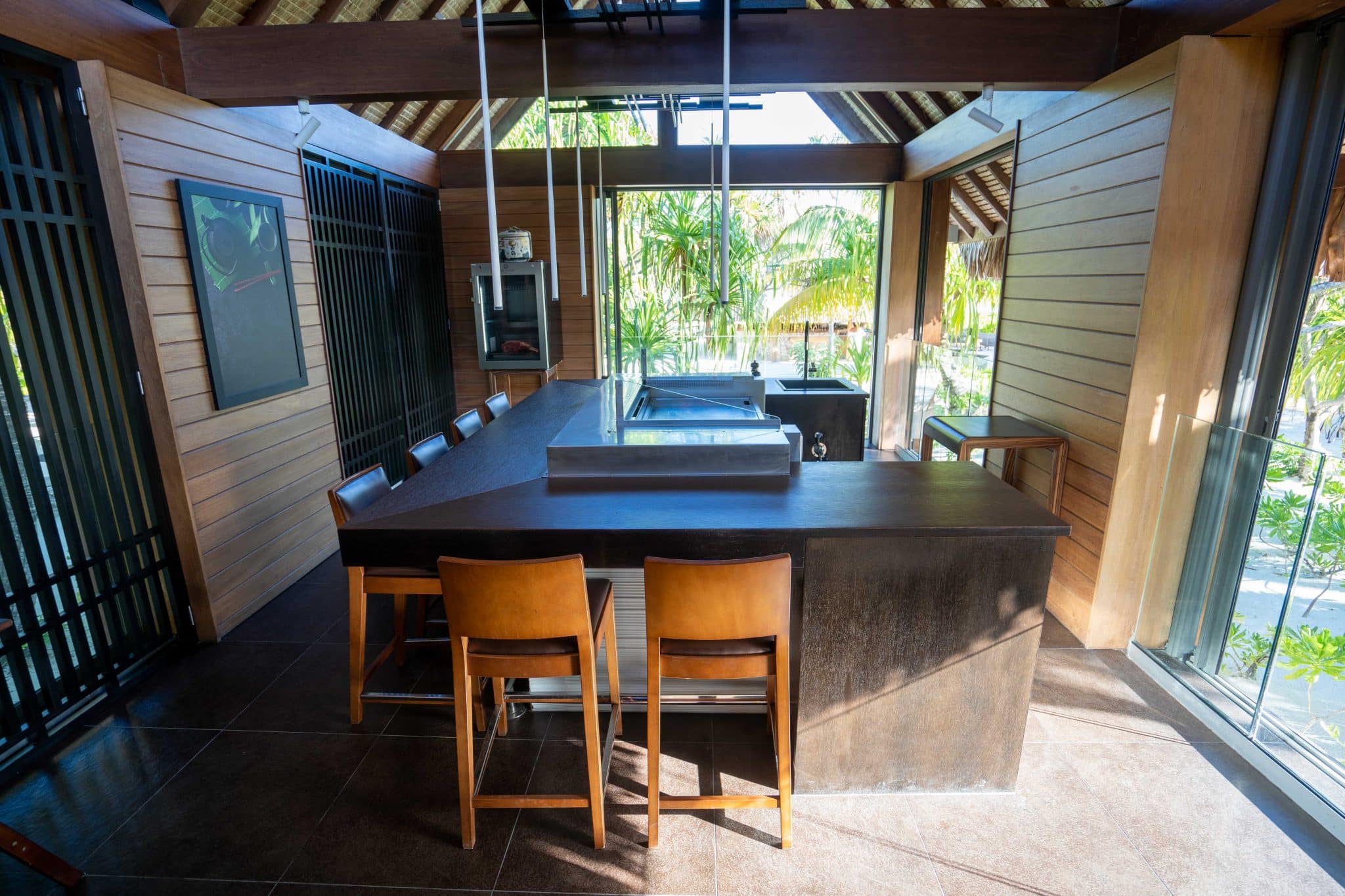 The Brando has four dining establishments plus one bar: the Beachcomber Café, Bob’s Bar, Nami, Les Mutinés, and Te Manu Bar. The Beachcomber Café is the resort’s all-day dining restaurant, offering breakfast, lunch, and dinner in a laid-back beachside ambiance, complete with outdoor seating and a picturesque lagoon view. The all-day-dining menu offers a blend of Polynesian, French, and international cuisines, with stand-out seafood dishes such as lagoon fish ceviche, Tahitian raw fish, swordfish carpaccio, rock octopus with pan-fried pineapples, and lobster rolls.