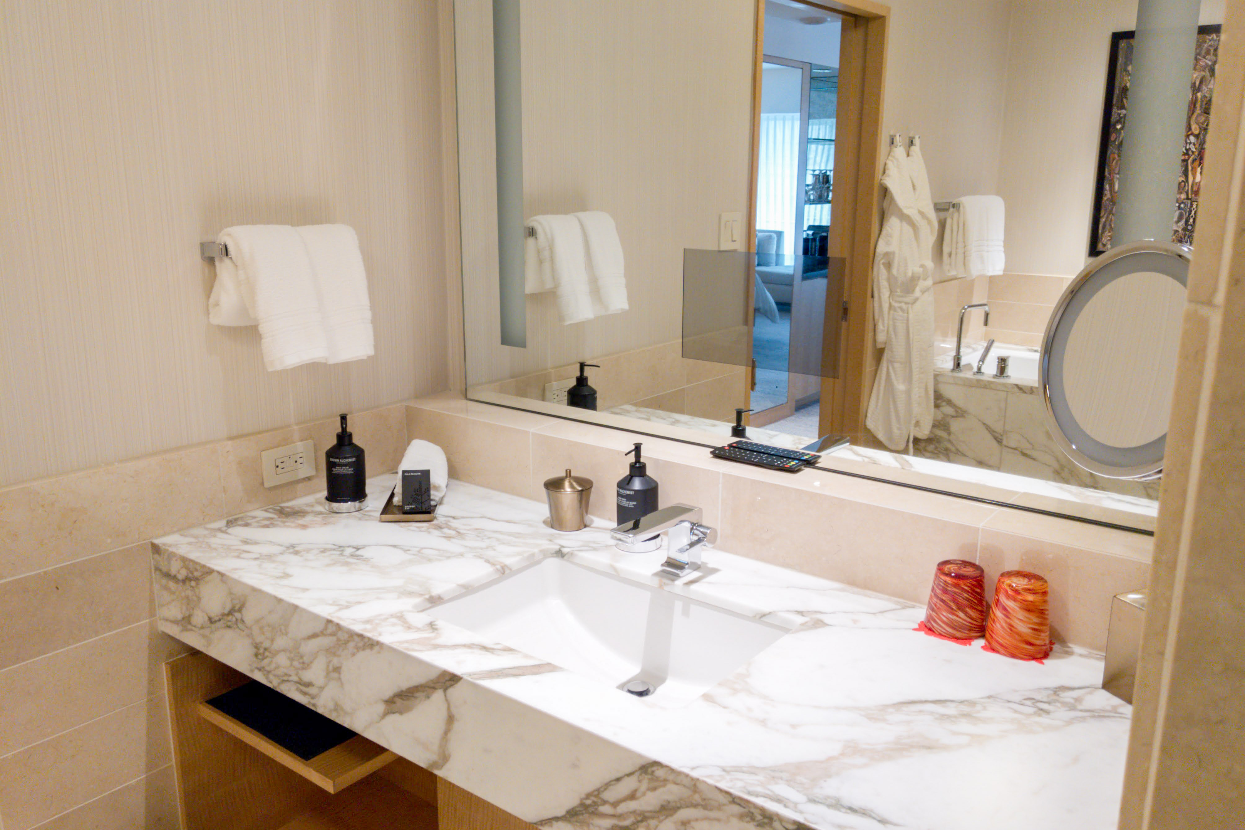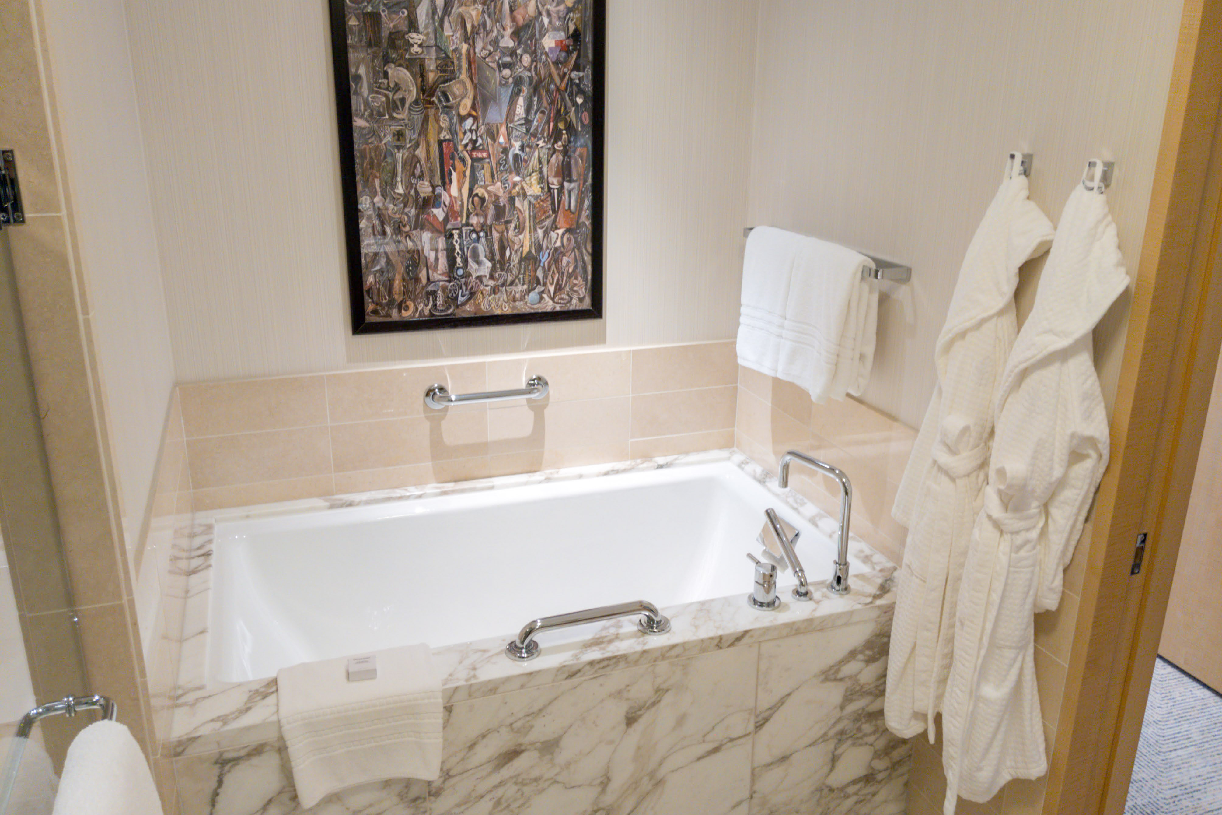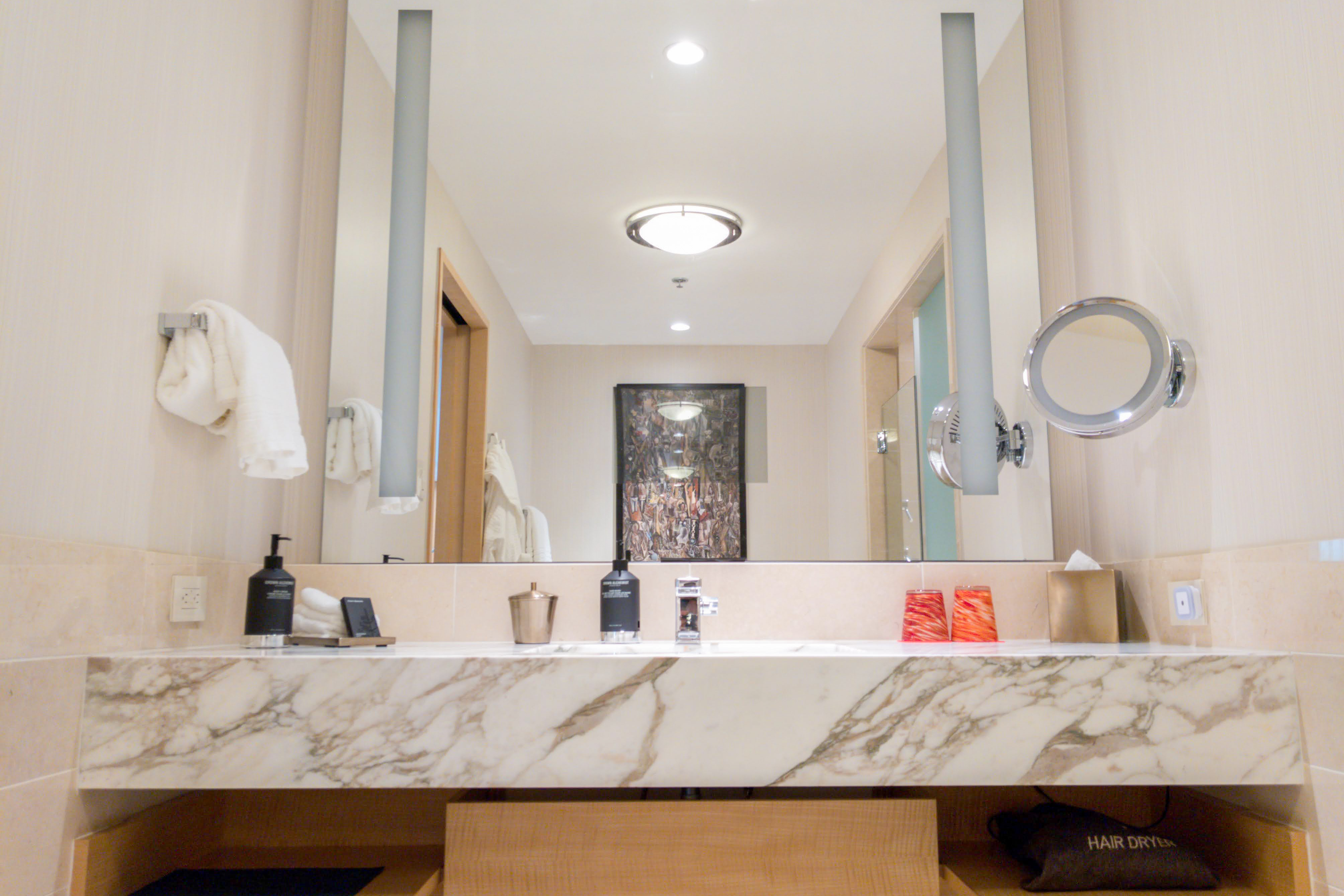 In the bathroom, the expansive vanity, with its polished marble countertop, offers ample space, and the large marble soaking bathtub invites you to unwind. The glass-enclosed rain shower, mimicking the famous Seattle rain, provides a rejuvenating experience with every drop. You can also keep an eye out for the model Boeing aircraft in your room, which pays homage to the city’s aviation history.